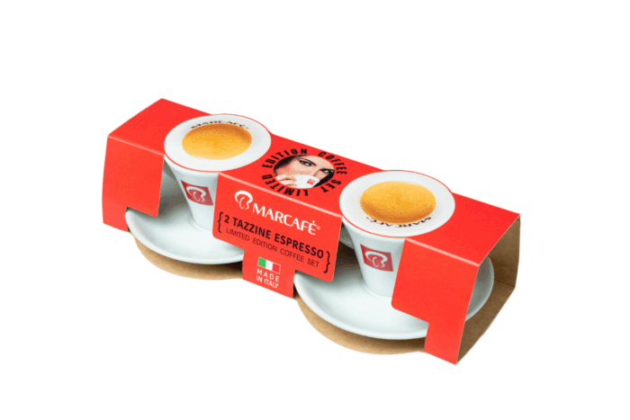 La confezione contiene 2 tazzine con il marchio Marcafè, le stesse che trovi nei bar, realizzate in porcellana di alta qualità, completa di piattini e lavabili in lavastoviglie.